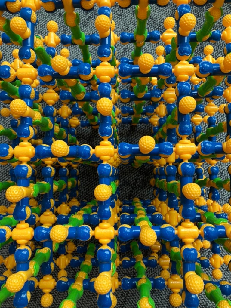 In our Giant Crystal model, there are spaces between the parts that are like the pores in a Metal–Organic Framework (MOF). This gives us a further opportunity to talk about the relationship between the crystal structure and its properties; i.e., structure-property relationships. In this case, the spaces enable us to trap pieces within the crystal, like molecules inside a MOF.
