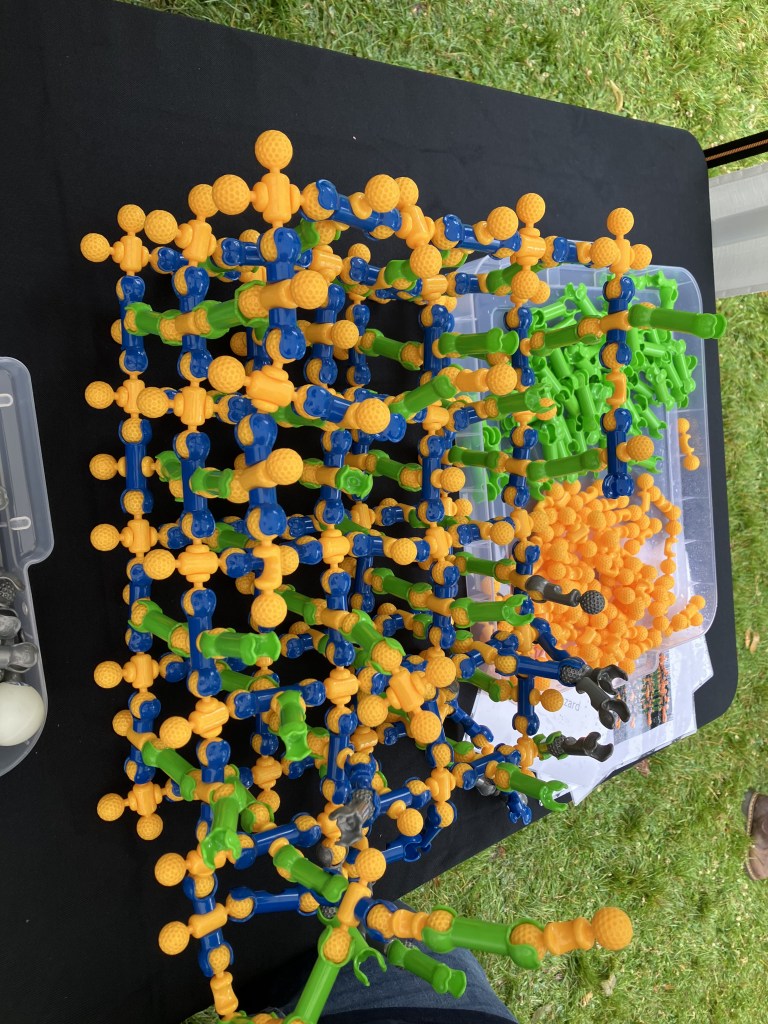 As the activity goes on, it’s quite likely that the addition of more pieces starts to deviate from the ‘perfect’ crystal of the first layer. This could be because people want to see what happens when they break the rules (fair enough), or because we introduce different pieces that can’t follow the same pattern of connections. This brings up topics such as defects, disorder and amorphous material into conversation. Sometimes, the defects are corrected and the crystalline region continues to grow, but otherwise, our Giant Crystal becomes a little less crystalline! Finally, we end up with a giant assembly of pieces, within which there are ordered regions and the original crystal can (usually) be identified.