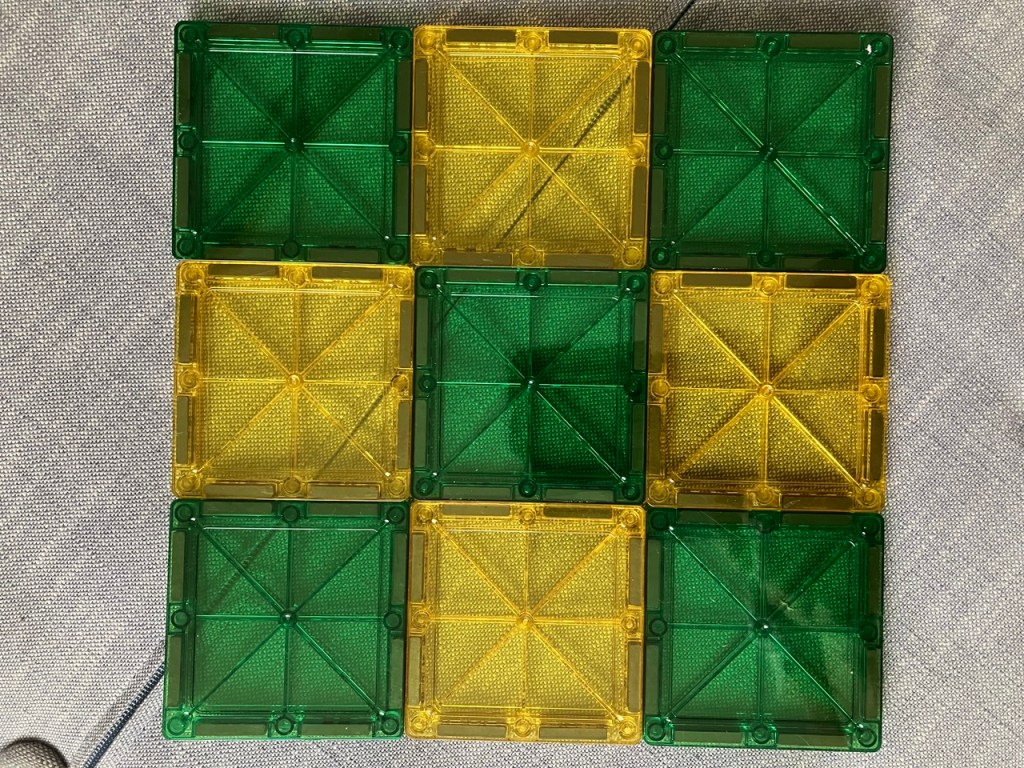 You will need a set of toy magnetic tiles (e.g., Magna-Tiles). The activity takes 5-15 minutes, or as long as you want to play!
